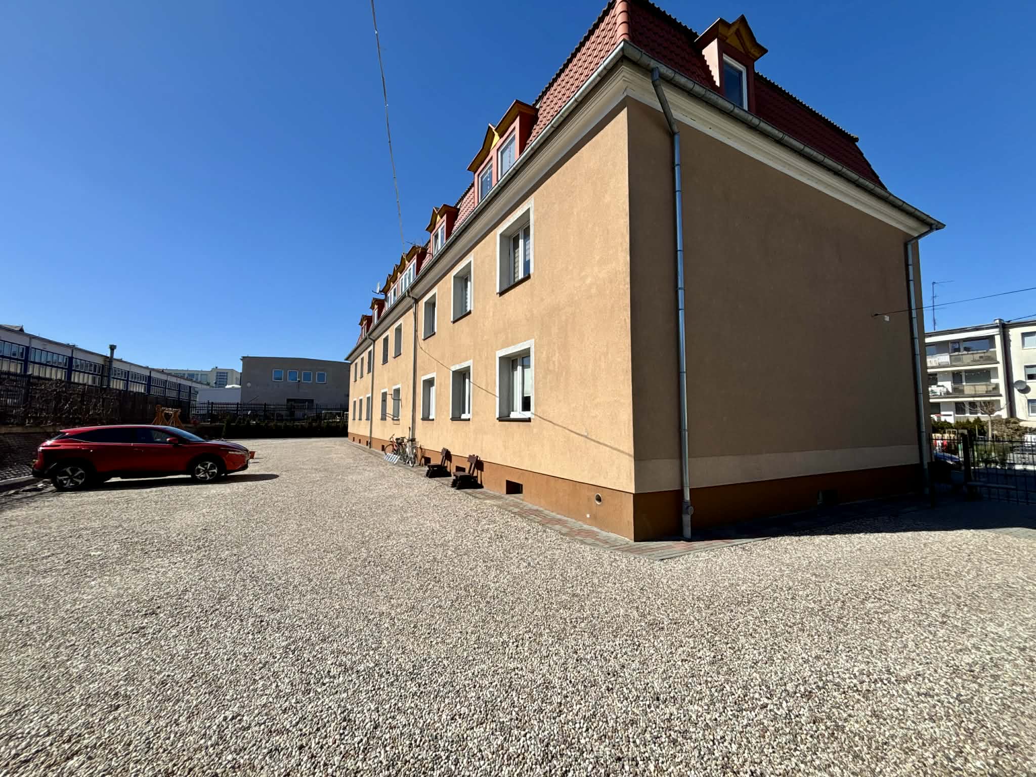 - teren wokół budynku jest ogrodzony i starannie zagospodarowany. Wjazd na parking został zabezpieczony bramą na pilota, co zapewnia wygodę i spokój dla mieszkańców,
